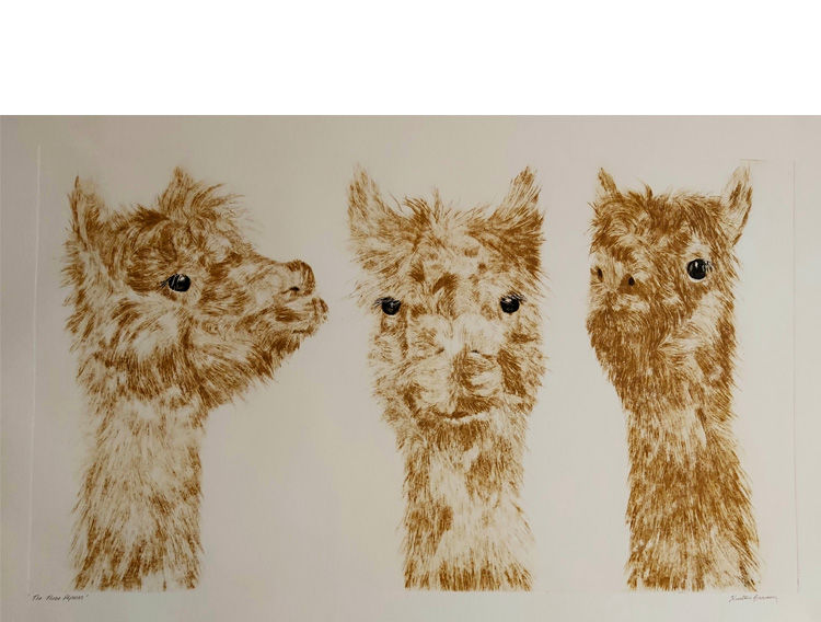 'The Three Alpacas' is a drypoint print in ochre of the character in a paddock on the way to the Chewton Res. I had stopped off to photograph the goat and the Alpaca made sure as to not be overlooked.