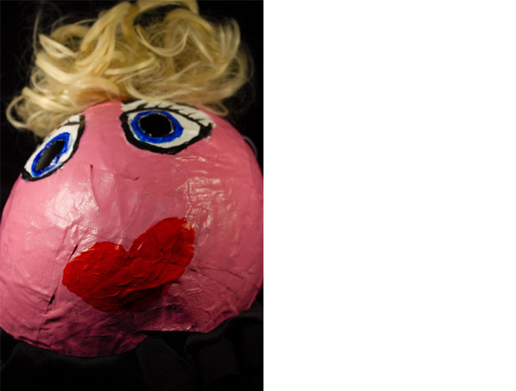 Paper mache pink face with blonde wig.